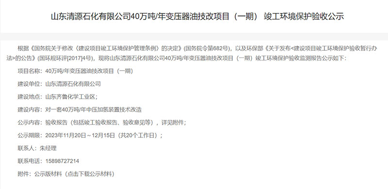 山東清源石化有限公司40萬噸/年變壓器油技改項目(一期)竣工環(huán)境保護驗收公示